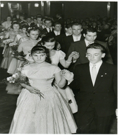 Da mein damaliger Tanzpartner (und heutiger Ehemann!) und ich schon zu dieser Zeit befreundet waren, machten wir Mittel- und Schlussball natürlich zusammen.Zum Abschlussball bekam das Mädchen von ihrem Tanzpartner einen Strauß, bestehend aus drei Nelken und Asparagus. Die Mädchen trugen lange Ballkleider, während die Jungen in dunklen Anzügen erschienen. Vor der großen Tür zum Kurhaussaal nahmen sie paarweise Aufstellung, und unter den Klängen von „Heinzelmännchens Wachtparade“ marschierten sie ein. Herr Hebgen – an den Händen weiße Handschuhe – führte die Polonaise an. Bewundernde und stolze Blicke der Eltern begleiteten die Paare. Danach folgten die einstudierten verschiedenen Tänze. Bevor der offizielle Teil zu Ende ging, standen noch die Pflichttänze an. Der junge Mann musste die Mutter seine Tanzpartnerin auffordern, während der Vater des Partners das Mädchen zum langsamen Walzer auf das Parkett holte.