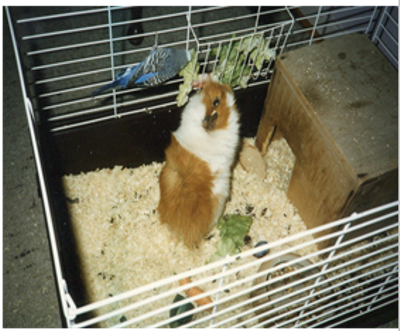 Aber irgendwann entdeckte er Willi und marschierte über die Rampe bis an den Rand des Käfigs, um ihn näher zu betrachten. Und dann hüpfte er in den Meerschweinchenkäfig. Karl war ein frecher Vogel. Er marschierte schnurstracks in das Holzhäuschen und Willi hinterher. Ein erschreckendes Rumoren, Gequietsche und Pfeifen drang aus dem Häuschen. Ich hielt die Luft an und befürchtete, dass der Vogel das nicht überleben würde. Eine Freundin, die bei mir zu Besuch war, griff beherzt zu und rettete Karl, der ziemlich zerzaust aussah und ganz schnell zurück in seinen Käfig marschierte. Es dauerte ein paar Tage, bis er sich wieder zu dem Meerschweinchen wagte. Sein Holzhaus betrat er allerdings nie mehr.